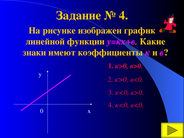 На рисунке изображен график линейной функции у=кх+в . Какие знаки имеют коэффициенты к и в ?