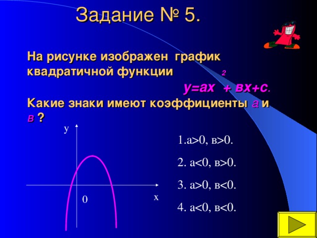Задание № 5. На рисунке изображен график квадратичной функции 2 у=ах + вх+с . Какие знаки имеют коэффициенты а и в ?