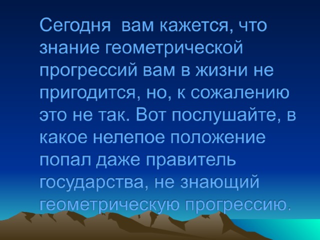 Сегодня вам кажется, что знание геометрической прогрессий вам в жизни не пригодится, но, к сожалению это не так. Вот послушайте, в какое нелепое положение попал даже правитель государства, не знающий геометрическую прогрессию.