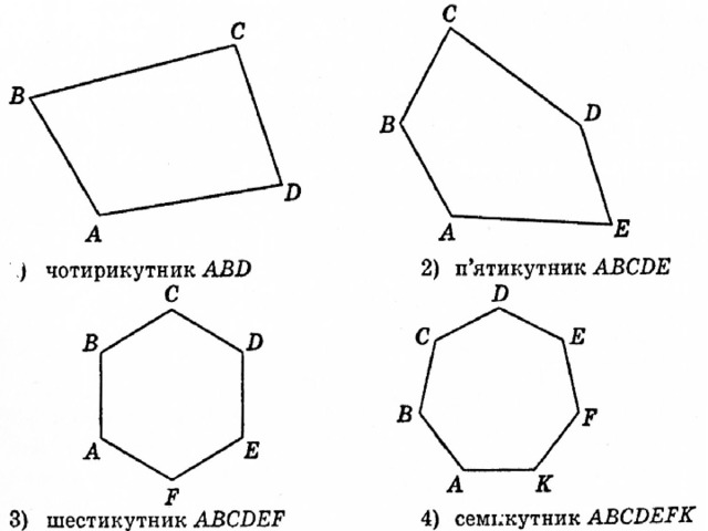 Наведено різні види многокутників, за готовими малюнками навчимося їх називати. За допомогою переходу від рівних відрізків та рівних кутів даємо означення рівних многокутників. Подаються наочні усні завдання для обчислення простих елементів многокутника. Вводиться поняття правильного многокутника.