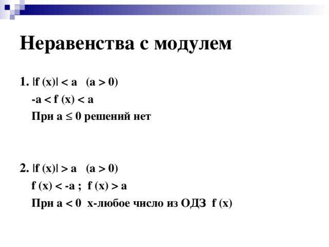 0) -a a При a ≤ 0 решений нет 2. | f (x) | a (a 0) f (x) -a ; f (x) a При a 0 x- любое число из ОДЗ f (x) " width="640"