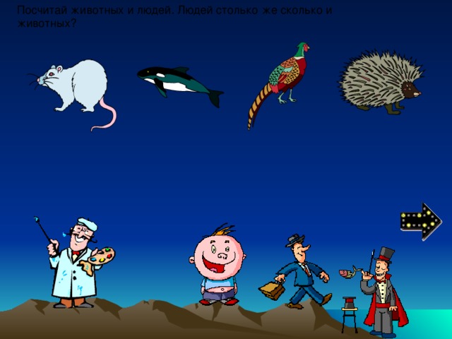 Посчитай животных и людей. Людей столько же сколько и животных?