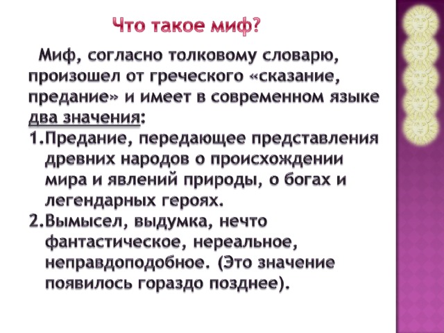 Миф, согласно толковому словарю, произошел от греческого «сказание, предание» и имеет в современном языке два значения: