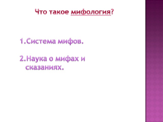 Миф – сказание, передающее верования и представления людей в древности о происхождении мира и жизни на земле, природы, о богах и героях.