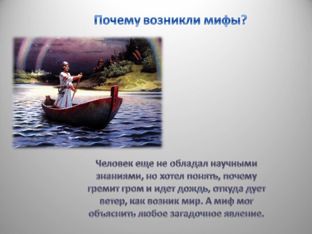 Человек еще не обладал научными знаниями, но хотел понять, почему гремит гром и идет дождь, откуда дует ветер, как возник мир. А миф мог объяснить любое загадочное явление.