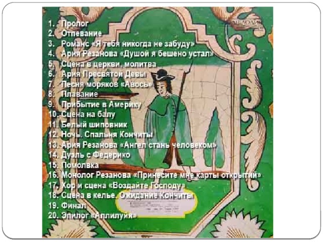 Именно Резанов как историческое лицо совершил первое кругосветное путешествие, а не Крузенштерн и Лисянский, как принято полагать. Темой путешествия графа Резанова поэт интересовался давно и возвращался к ней не раз. Самый известный отрывок из рок-оперы был написан ранее в 1976году. В нем появляется тема прощания с любимой и родиной, являющейся главным лейтмотивом всего произведения, поразительно точно передающим настроение и эмоциональную окраску самой рок-оперы: