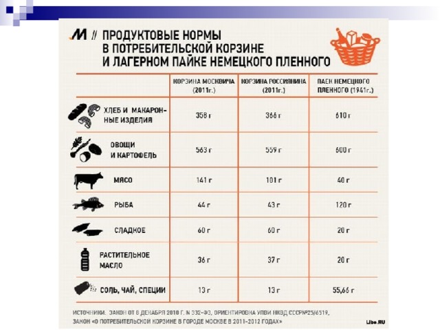 Набор продуктов питания, т.н. минимальная продовольственная "корзина", обеспечивает содержание по химическому составу продуктов и их калорийности в следующих пропорциях (в сутки):