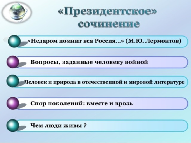 Темы сочинений, сформулированные на материале творчества М.Ю. Лермонтова, нацеливают на размышления о своеобразии творчества М.Ю. Лермонтова, особенностях проблематики его произведений, специфике художественной картины мира, характерных чертах лермонтовского героя и т.п.