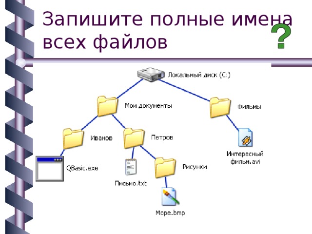 Для того чтобы найти файл в иерархической файловой структуре необходимо указать путь к файлу. В путь к файлу входят записываемые через разделитель "\" логическое имя диска и последовательность имен вложенных друг в друга каталогов, в последнем из которых находится данный нужный файл.
