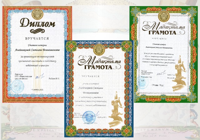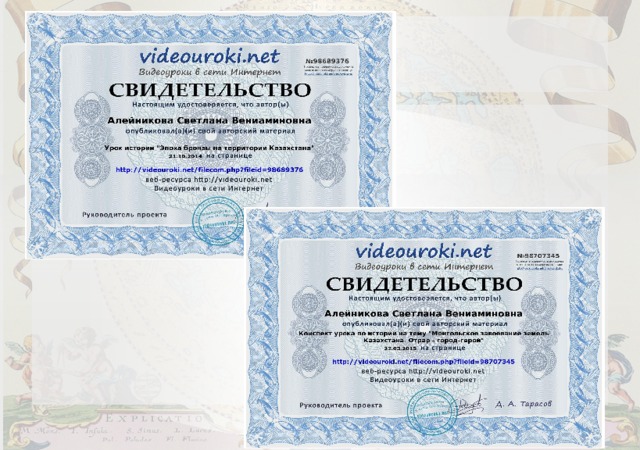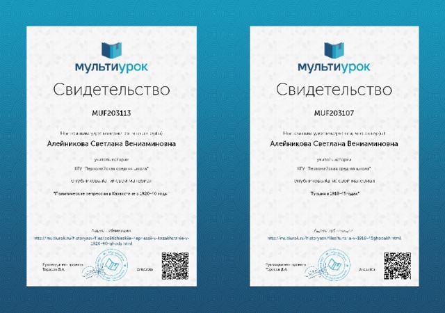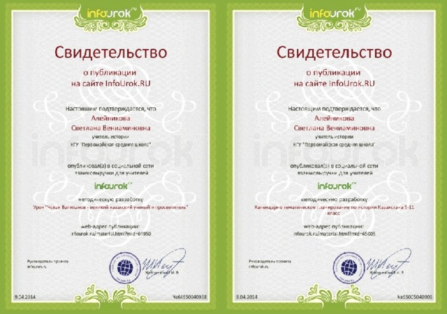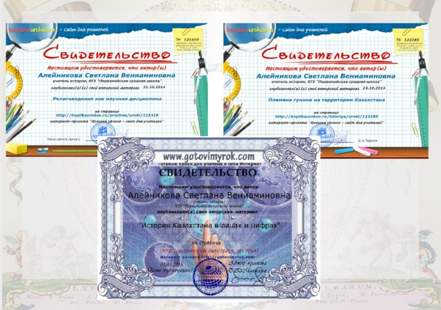 - Курсы повышения квалификации по истории «Изменение структуры и содержания курса история Казахстана в условиях модернизации образования Республики Казахстан» АО «НЦПК «Өрлеу» ИПК ВКО ПРО октябрь 2013г.