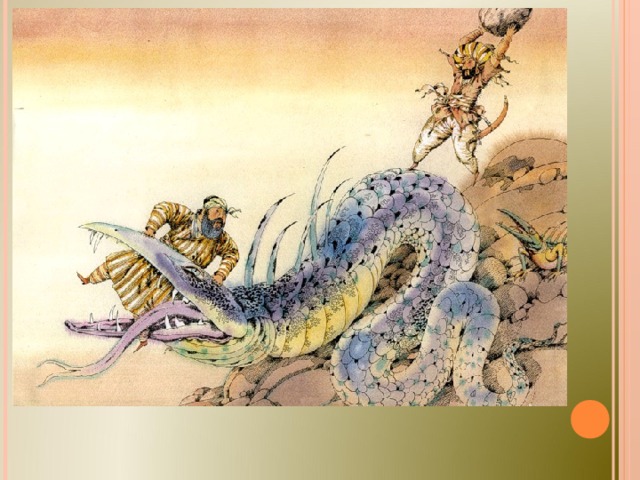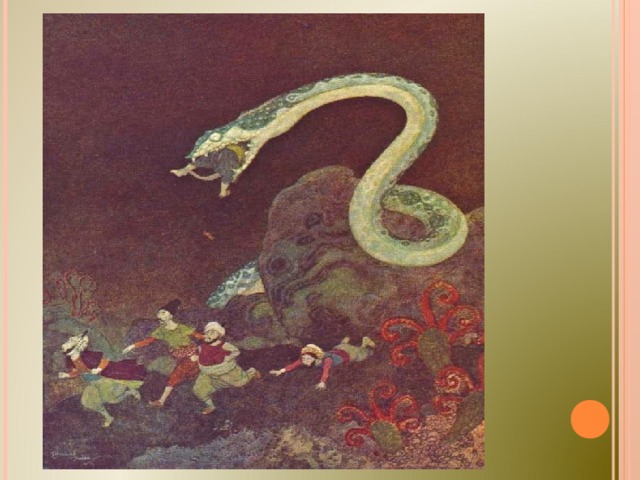 - И вдруг из-под горы выползла змея, державшая в пасти человека, которого она проглотила до пупка