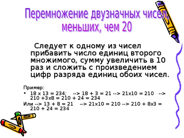 18 + 3 = 21 -- 21 х 10 = 210 -- 210 + 3 х 8 = 210 + 24 = 234 Или -- 13 + 8 = 21 -- 21 х 10 = 210 -- 210 + 8 х 3 = 210 + 24 = 234 " width="640"