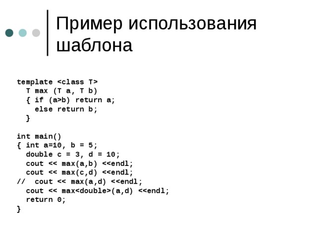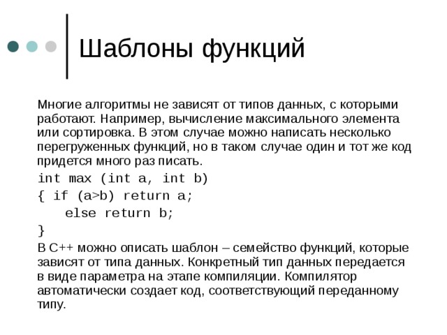 b) return a; else return b; } В С++ можно описать шаблон – семейство функций, которые зависят от типа данных. Конкретный тип данных передается в виде параметра на этапе компиляции. Компилятор автоматически создает код, соответствующий переданному типу. " width="640"