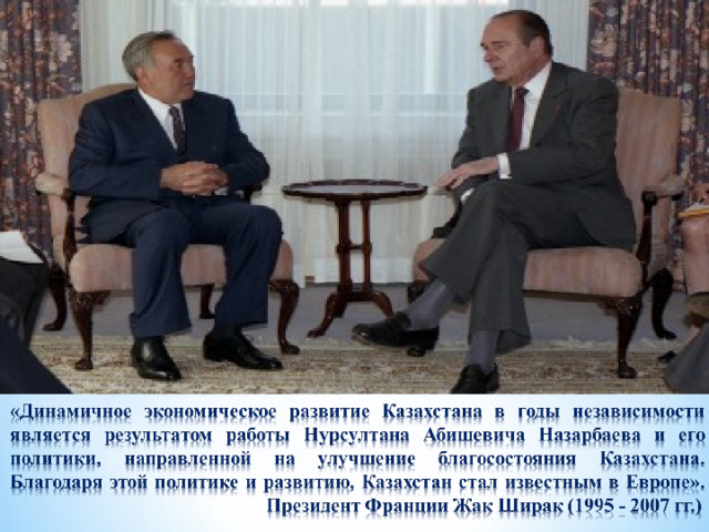 «Авторитет Президента Казахстана в тюркском мире очень высок, нельзя не отметить огромный вклад Нурсултана Назарбаева в развитие отношений с братским турецким народом, в достижение единения тюркских народов в целом». Президент Турецкой Республики Реджеп Тайип Эрдоган