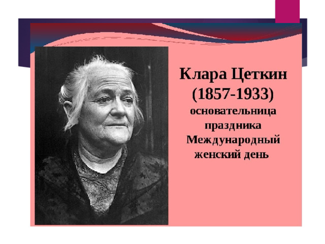 - Ежегодному празднованию Международного женского дня положила начало Вторая Международная конференция социалисток, состоявшаяся в Копенгагене в 1910 году. Праздновать этот день предложила Клара Цеткин. Одной из целей была обозначена борьба за всеобщее избирательное право для женщин. Предложение получило единодушную поддержку более 100 женщин из 17 стран, однако дата празднования зафиксирована не была . До 1914 года в разных странах этот день отмечали в различные числа марта .