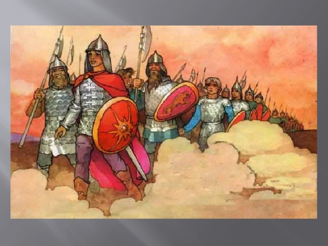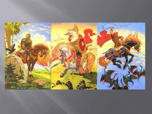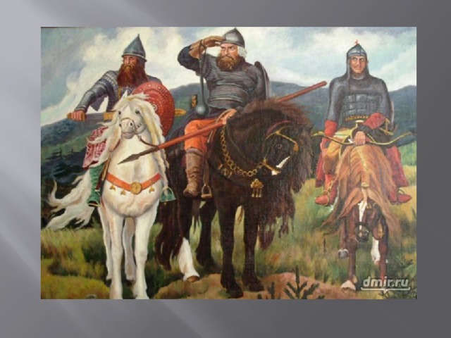 Илья Муромец – одержал победу над соловьём разбойником, Алёша Попович одержал победу над Тугарином змеем, Добрыня Никитич защищал от монголо- татарского иго.