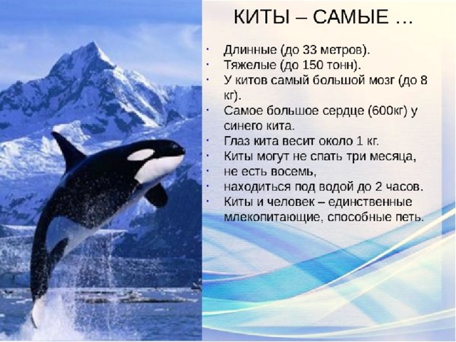 Морские млекопитающие объединяют животных различных по длине и массе тела. Здесь можно встретить мелких тюленей и дельфинов, вес которых не превышает 50 кг, и крупных исполинов как, например, синего кита, вес которого может достигать 160 т.