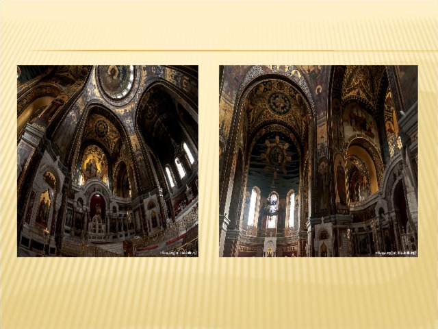 - Храм имеет снаружи характерную для византийских церквей пирамидальную форму: его венчает большой центральный купол, меньшие же по размеру, боковые, располагаются ниже и как бы ему аккомпанируют. Сам купол в виде опрокинутой полусферы, напоминает широкий свод небесный, место невидимого прерывания Господа, покрывающий землю. Подобная форма купола является типичным знаком византийской архитектуры