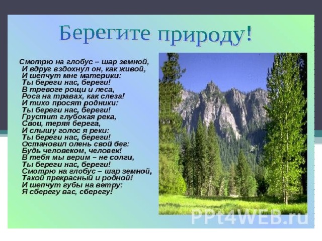 - ПРОСЬБА Роберт Рождественский Раненая птица в руки не давалась, Раненая птица птицей оставалась. Этот сон давнишний до сих пор мне снится: На траве кровавой вздрагивает птица. Припев: Птицы, рыбы и звери В души людям смотрят. Вы их жалейте, люди, Не убивайте зря; Ведь небо без птиц — не небо, А море без рыб — не море! И земля без зверей — не земля, Не земля, не земля! Люди-исполины, люди-великаны, Есть у вас винтовки, сети и капканы, Есть у вас бесстрашье, сила есть навечно. И должно быть сердце — сердце человечье. Люди-человеки, страны и народы, Мы теперь навечно должники природы. Надо с этим долгом как-то расплатиться, Пусть расправит крылья раненая птица!