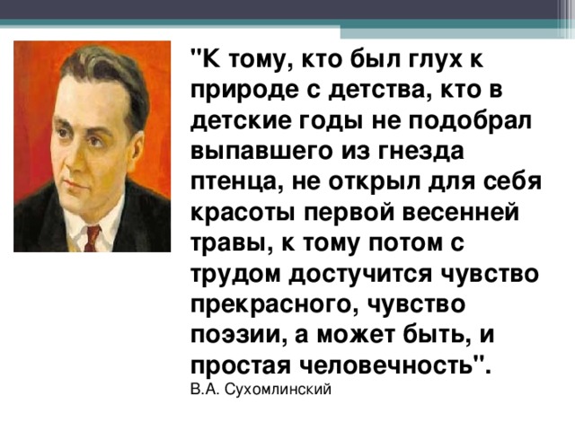"К тому, кто был глух к природе с детства, кто в детские годы не подобрал выпавшего из гнезда птенца, не открыл для себя красоты первой весенней травы, к тому потом с трудом достучится чувство прекрасного, чувство поэзии, а может быть, и простая человечность".