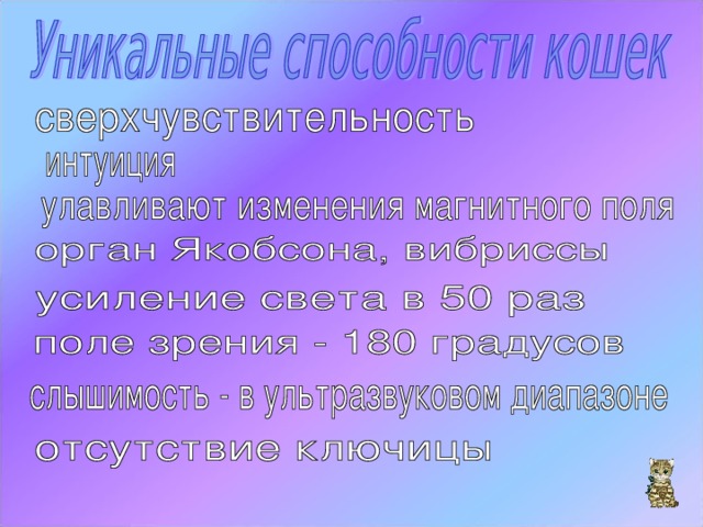- Найти пословицы, песни, потешки, сказки, загадки о кошках. Определить те черты характера кошек, которые нравились или не нравились людям.
