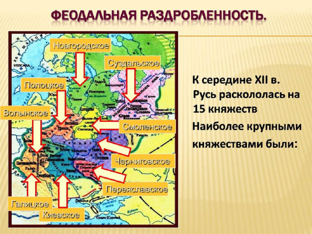 - 19 октября 1097 г. на совете князей в Любече был провозглашен принцип наследования князьями земель своих отцов. Это решение констатировало наличие нового политического строя на Руси, и должно было привести к прекращению междукняжеских распрей из-за уделов и сплотить их против разорявших русские земли половцев. Теперь каждый из князей правил самостоятельно на земле, доставшейся ему от отца — «каждый да держит отчину свою». Это решение узаконило уже фактически состоявшееся разделение Руси на удельные княжества.