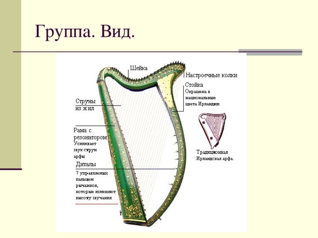Арфа относится к струнно щипковым инструментам. * На арфе семь педалей, по числу звуков, составляющих диатоническую гамму. Педали называются соответственно: до, ре, ми, фа, соль, ля, си. Расположение их следующее: справа от исполнителя четыре (ми, фа, соль, ля), слева — три (си, до, ре). Два ряда специальных зарубок фиксируют положение педалей в определенной тональности. Так, в строе Ces - dur, например, педали находятся в первом ряду; перемещая их на первую зарубку, повышают весь строй инструмента на полтона и получают C - dur, a смещением на вторую зарубку — Cis - dur. Переводя педаль Сразу на вторую зарубку, Получают повышение на целый тон. Комбинируя таким образом положение педалей, исполнитель перестраивает арфу в различные тональности мажора и минора.