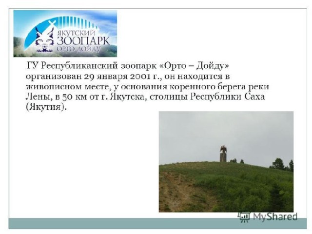 Зоопарк находится в живописном месте, у основания коренного берега реки Лены, в 50 км от города Якутск – столицы Республики Саха (Якутия).