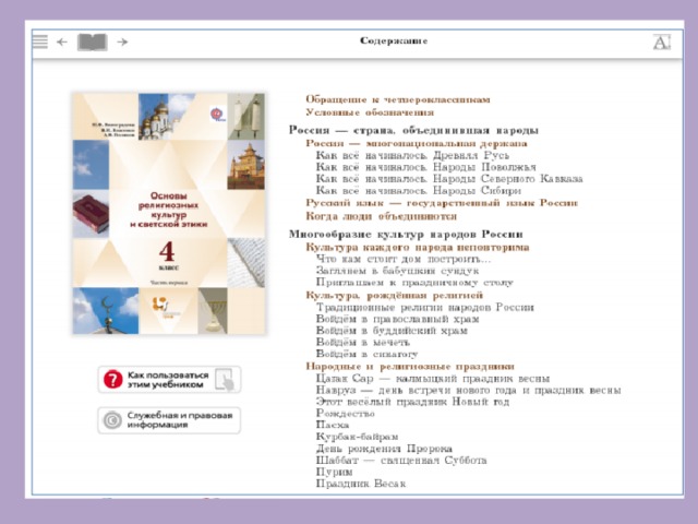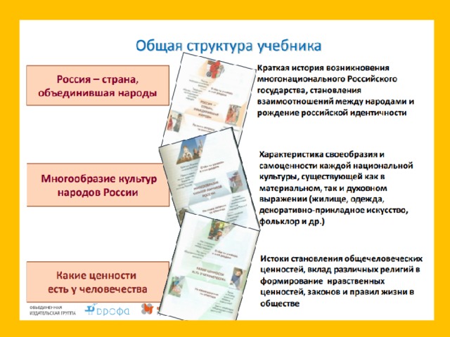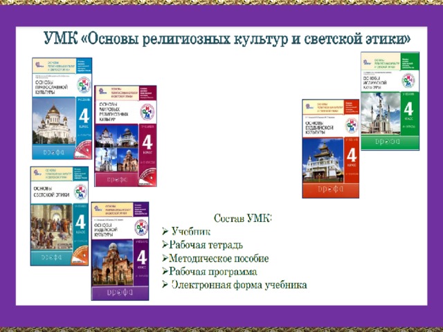Учащиеся знакомятся с основами светской этики, с традиционными религиями нашей страны, с их особенностями, проводят параллели между религиями, что способствует нравственному самосовершенствованию, духовному росту ребенка, формированию понимания значения нравственности, веры и религии в жизни человека, семьи и общества. Материал учебников дается и в историческом аспекте, показывая роль традиционных религий в развитии культуры и истории России и человечества, в становлении гражданского общества и российской государственности, формируя при этом патриотизм и уважение к Отечеству, осознание свой этнической принадлежности.