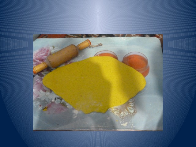 Раскатываем тесто скалкой, немножко смоченным водой. «Блинчик» около 4 мм