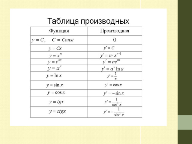 - Повторили определение производной функции и формулы дифференцирования.