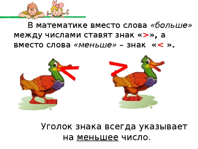В математике вместо слова «больше» между числами ставят знак « », а вместо слова «меньше» – знак « ». Уголок знака всегда указывает на меньшее число. " width="640"