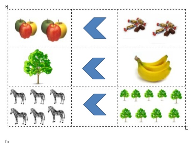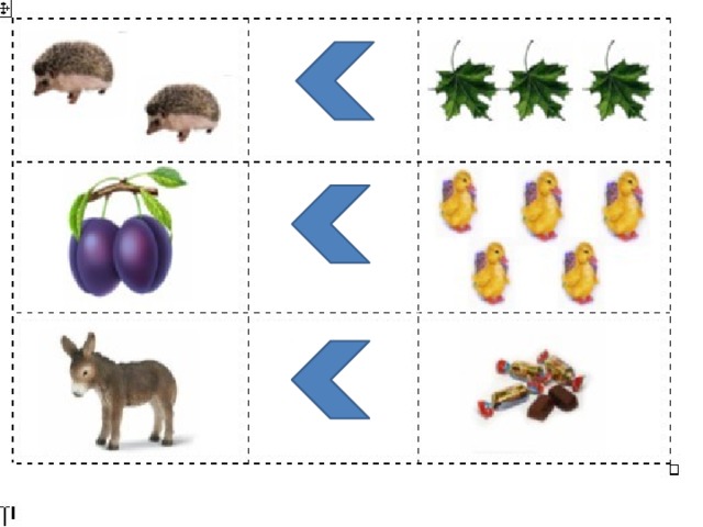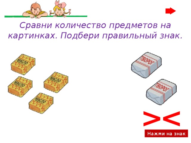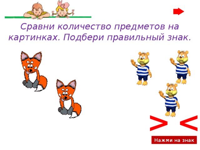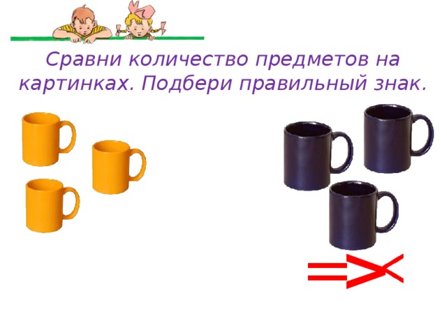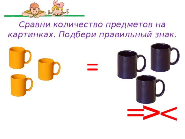Сравни количество предметов на картинках. Подбери правильный знак.