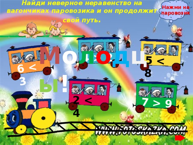 9 5 Нажми на паровозик Найди неверное неравенство на вагончиках паровозика и он продолжит свой путь . М о л о д ц ы ! 4 2 2 " width="640"