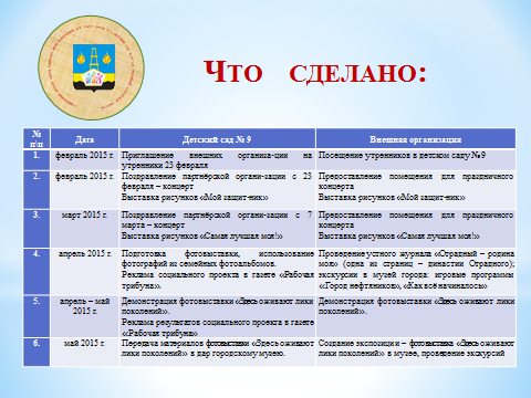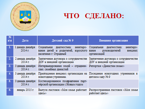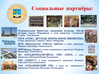 | Социальные партнёры: МБУК «Музей истории г. Отрадного» в лице директора Гурьяновой Галины Тимофеевны ГБУК ДЕТСКАЯ БИБЛИОТЕКА в лице директора Гущиной Л.Х. МУП «Рабочая трибуна» в лице директора Чижова А.А. ООО фирма «Гранит» в лице директора Муратова В.Н. ФЛ «ОТРАДНОЕМЕЖРАЙГАЗ» в лице директора Заботиной Е.В. ЗАО «ТАРКЕТТ» в лице директора Нуждина А.К. ЗАО «ОТРАДНЕНСКИЙ ГПЗ» в лице директора Федечкина В.В. | |