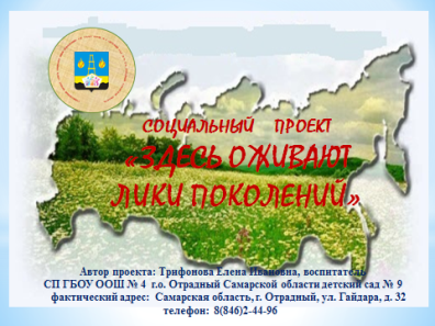 | социальный проект «Здесь оживают лики поколений» Автор проекта: Трифонова Елена Ивановна, воспитатель СП ГБОУ ООШ № 4 г.о. Отрадный Самарской области детский сад № 9 | |