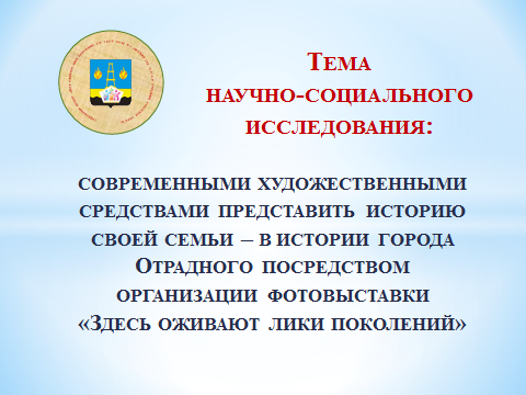 | Тема научно-социального исследования: современными художественными средствами представить историю своей семьи – в истории города Отрадного посредством организации фотовыставки «Здесь оживают лики поколений» | |