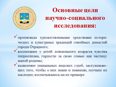 | Основные цели пропаганда художественными средствами исторических и культурных традиций семейных династий города Отрадного; воспитание у дошкольников чувства патриотизма, гордости за свою семью как частицу малой родины; выявление уникальных людских судеб, заслуживающих того, чтобы о них знали и помнили, изучали их наследие, воспитывались на их примере | |