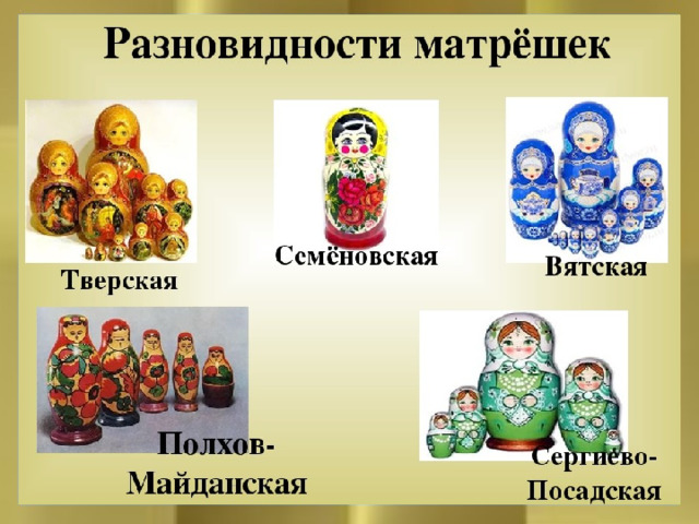- Своей формой полховская матрёшка заметно отличается от семёновских матрёшек. Кроме того, удивляет ее необыкновенное многообразие от многоместных, подчеркнуто вытянутых по вертикали матрёшек с маленькой, жестко очерченной головкой до примитивных одноместных матрёшек – столбиков и толстеньких, похожих