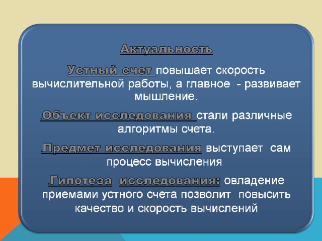 - Сделали вывод о подтверждении гипотезы -овладение приемами устного счета позволяет повысить качество и скорость вычислений.