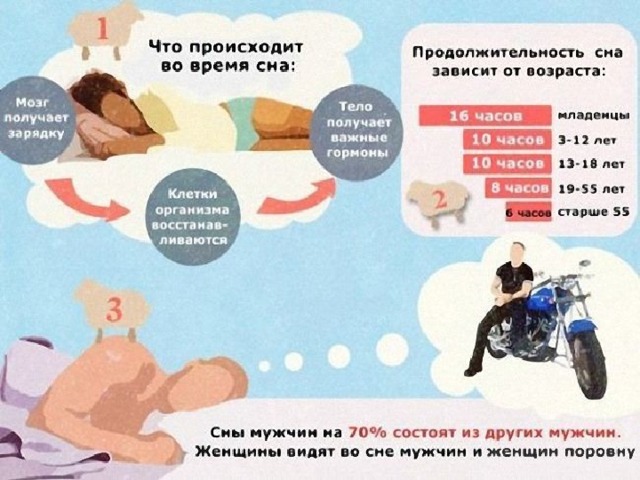 Младенцы обычно спят не менее 16 часов в сутки. Детям дошкольного возраста рекомендуется спать не менее 11 часов, школьникам — не менее 10 часов. В подростковом возрасте 9 часов сна ночью, как правило, недостаточно. Для большинства же взрослых лучшим вариантом будет 7 — 8 часов сна в сутки.
