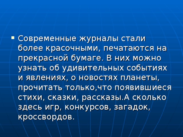 Первый журнал вышел во Франции 340 лет назад. Он содержал обозрение книг по литературе, естественным наукам, искусству. В России журналы появились на 1оо лет позднее. А первый детский журнал назывался «Детское чтение для сердца и разума»