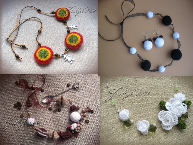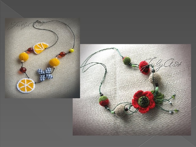 - Бусины, обвязанные крючком , могут стать основой очень многих украшений: бус, браслетов, сережек, брошей, разных декоративных элементов одежды.