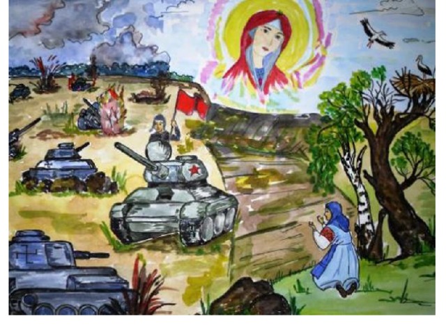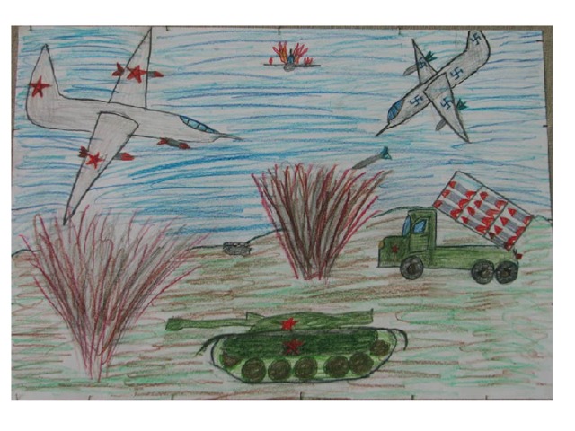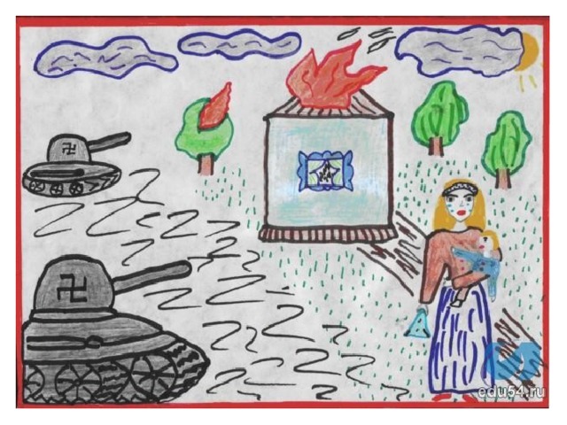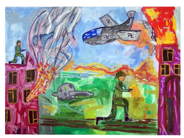 В классе проходил конкурс рисунков на тему "Война глазами детей". Лучшие рисунки были преставлены в презентацию. Можно использовать на уроках и во внеклассной работе.