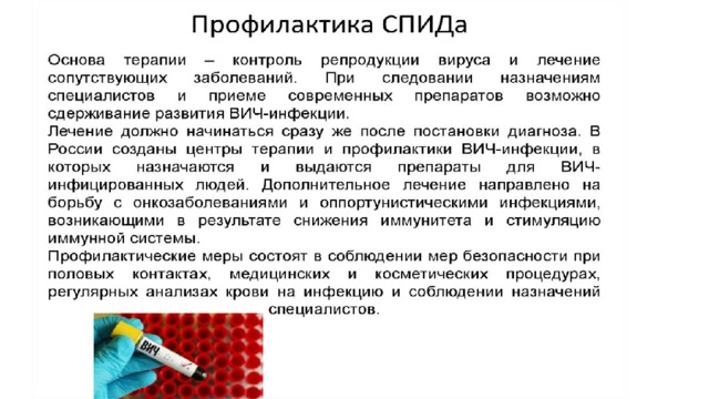 СПИД – синдром приобретенного иммунодефицита - является следствием развития ВИЧ-инфекции, одним из главных ее маркеров и проявляется полным подавлением иммунитета. Состояние наступает примерно через 5 лет после заражения. Любое заболевание, возникающее на фоне ВИЧ, способно привести к летальному исходу. Диагностика нацелена на выявление ВИЧ-инфекции, проверку количества иммунокомпетентных клеток, антител к вирусу. Цель терапии – подавить возбудителя путем применения противовирусных препаратов. Обязательной является элиминация бактерий, грибков, вирусов, провоцирующих развитие вторичных патологий.
