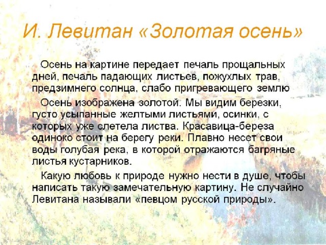 - https://yandex.ru/images/search?text= Составление%20рассказа%20по%20репродукции%20картины%20И.И.Левитана%20«Золотая%20осень»& img _