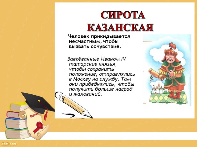 БИБЛИОТЕКАРЬ: У нас в библиотеке есть словари крылатых слов и выражений. Они и расскажут, кто же такая “сирота казанская” и какой Васька слушает и ест.