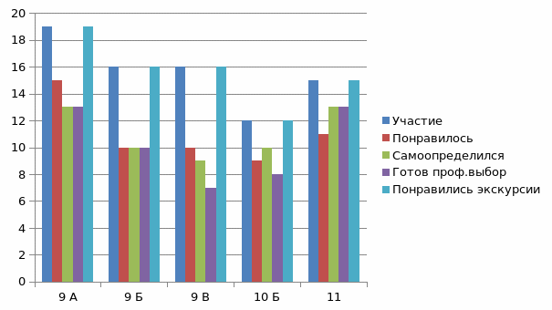 Анкетирование проводилось в виде тестирования на профориентационных занятиях с целью выявления профессиональных интересов, наклонностей, способностей. В анкетировании приняло участие 78 человек. Из них - 55 обучающимся понравилось принимать участие в реализации проекта. 55 школьников определились в выборе своей будущей профессии. 78 обучающихся выделили из проекта самое интересное: это – экскурсии.