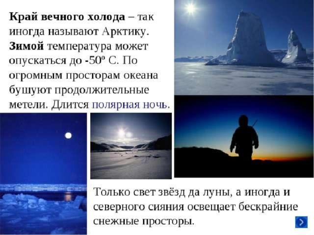 - рассмотреть особенности природы и взаимосвязь природных компонентов в природной зоне Арктики; начать формирование представления о возможностях хозяйственного использования природной зоны и связанных с ними экологических проблем.