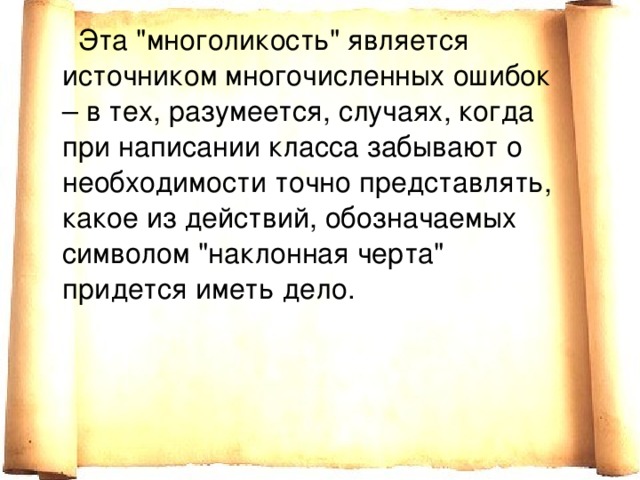 Как видите, один и тот же символ ("наклонная черта") при всех своих использованиях так или иначе связан с операцией деления (ведь вычисление частного производится тоже в результате деления), однако значения, которые получаются в результате его использования, могут численно отличаться друг от друга.